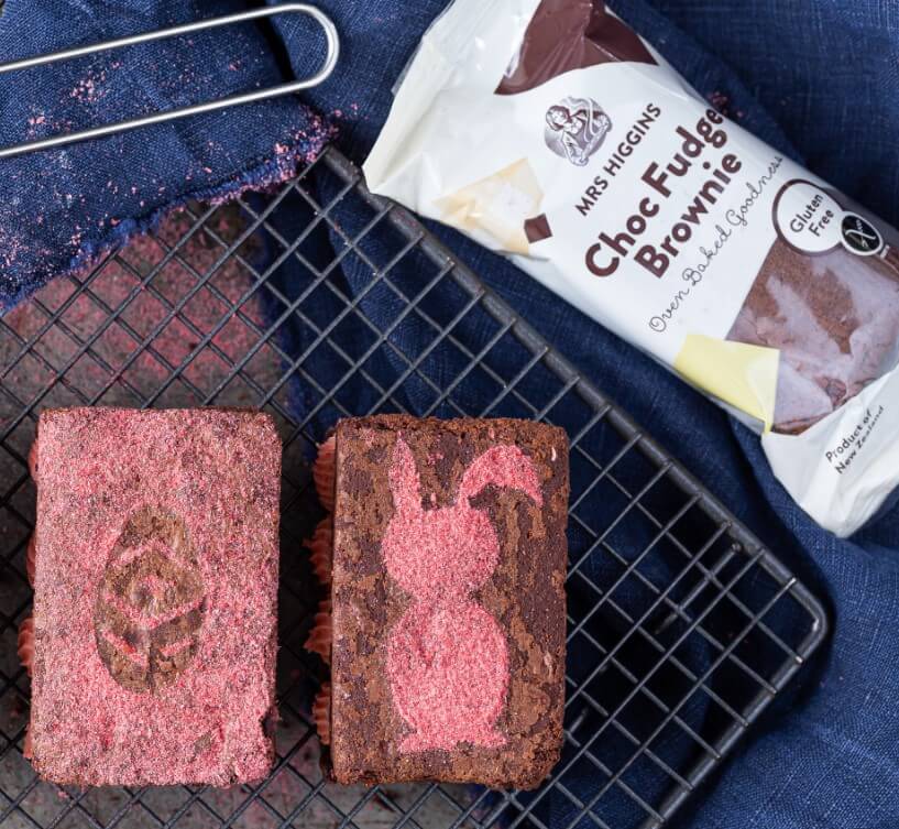 Notes: You can use plain icing sugar instead of strawberry powder. To make stencils draw your easter shape on a piece of parchment paper large enough to cover brownie and cut shape out.