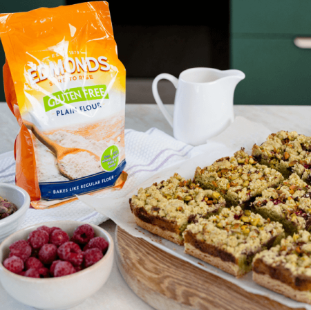 Gluten-Free Pistachio Crumble Slice with Matcha, Raspberry & Chocolate Frangipane