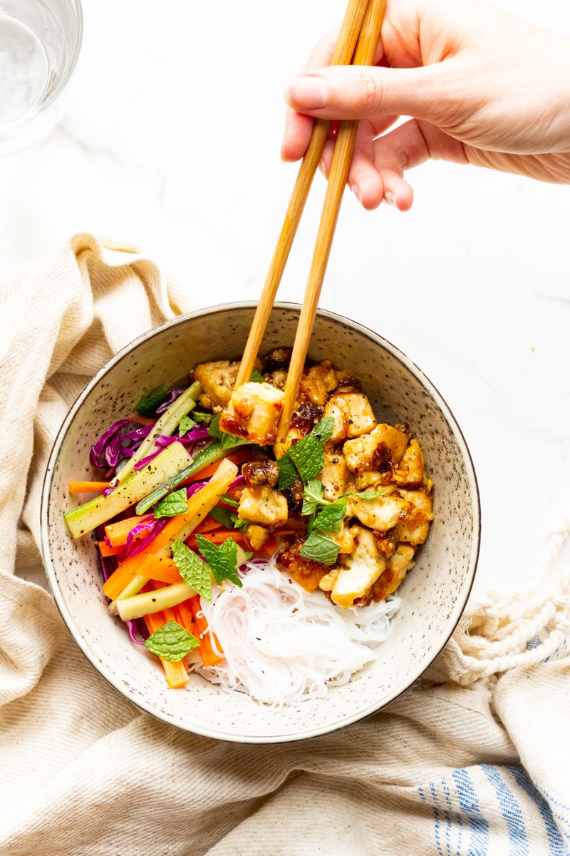 Prep in advance: You can marinate the tofu and prep the pickled vegetables a day in advance to make assembling the meal super fast.