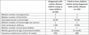Our survey respondents reported an average of two births per person, and there was no meaningful difference in the number of births between women who already had a coeliac disease diagnosis and those who had not been diagnosed when they started their families.