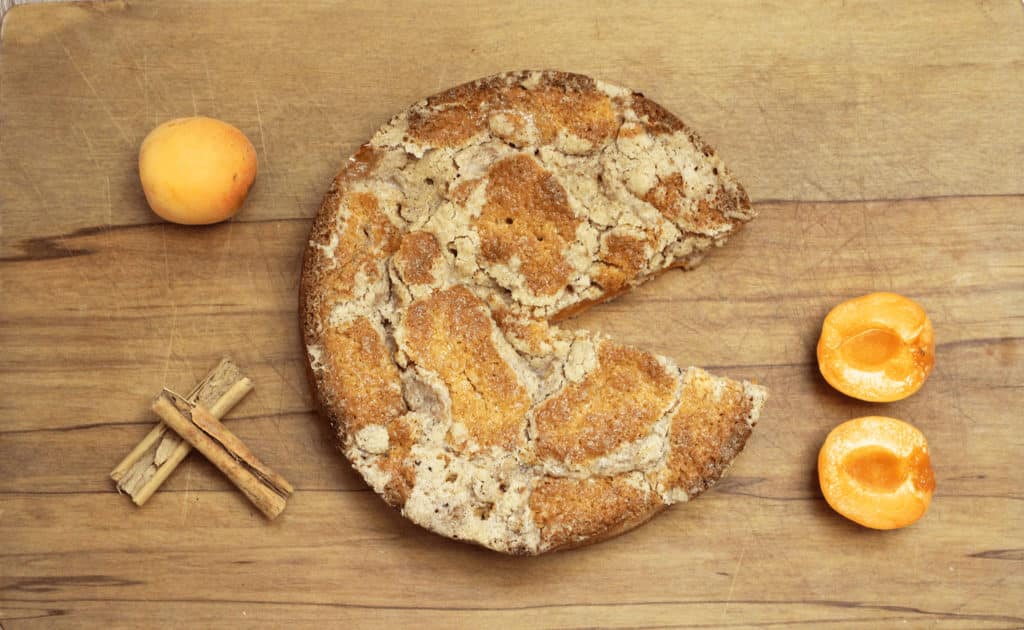 - Halve and stone the apricots. Arrange on top of the cake mixture cut-side up and sprinkle evenly with the crumble.