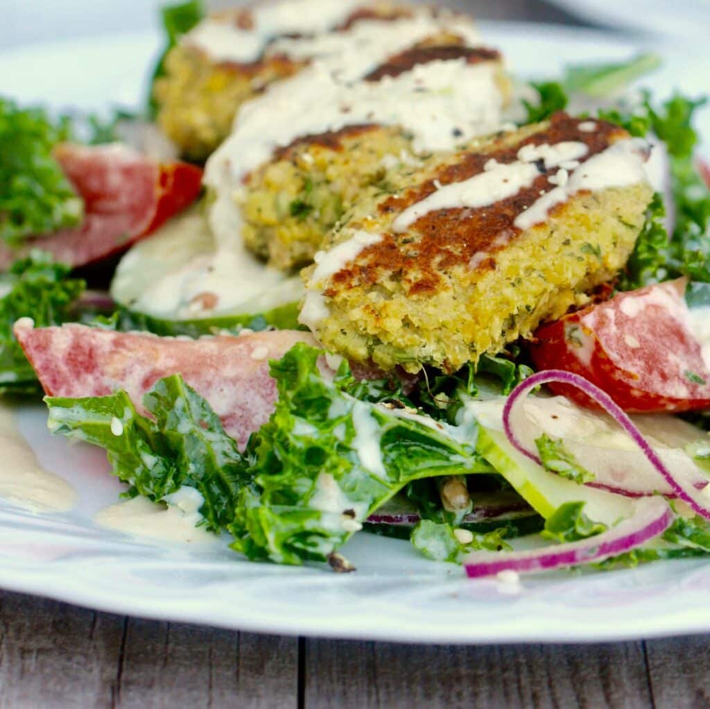 - Plate up the kale salad on each plate, top with cucumber, tomatoes, red onion, falafels, drizzle with dressing, then top with extra herbs and sesame seeds if desired. Serve with freshly toasted wholemeal pita breads, or your favourite gluten free pita/wrap equivalent. Put the extra dressing on the table in case anyone wants a top up!