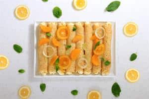 - Arrange the crepes on a plate and scatter over the fresh citrus segments and mint. Dust liberally with the extra sugar and then spoon over the candied citrus and some of it’s syrup.
